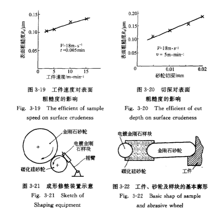 精密時(shí)參數(shù):工件速度3~5mmin-1,砂輪切深O0.005~0.010mm,砂輪速度為18ms1。這樣,試件的表面粗糙度R值可控制在0.16pm以?xún)?nèi)。成形磨削用樹(shù)脂結(jié)合劑金剛石砂輪。